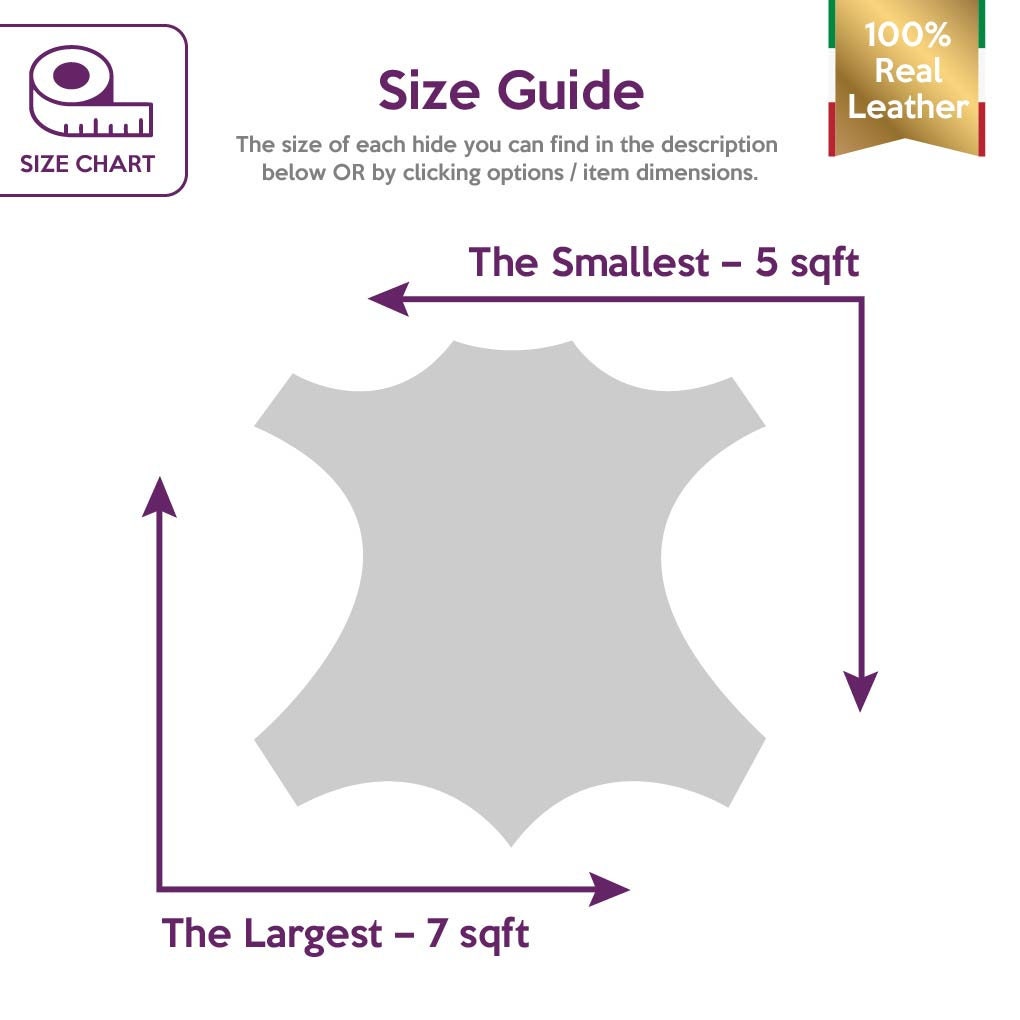 -Keep in mind that dimensions (square footage, square meters) on LEATHER refers to total workable surface area as hide shape is not consistent, so if this is the first time you buy genuine leather don`t be confused with measurements, for example 9 sqf DON`T mean 3 sqf of length x 3 sqf of wide.
