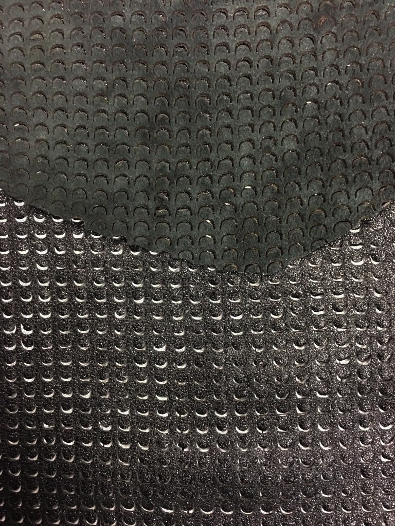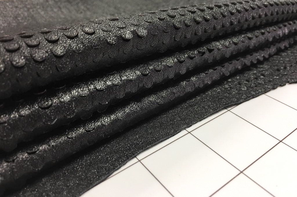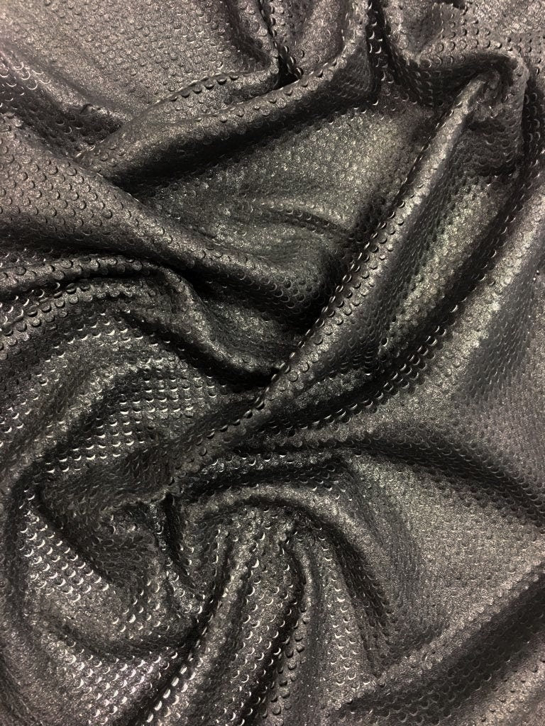 -Black leather fabric, leather material with holes, shiny leather print, laser cut leather sheets. Genuine lambskin pieces, black sheep skin pelt. Mermaid skin type leather, Textured leather material, black leather fabric. Thin and lightweight fabric. Scale type laser cuts. Leather good for sewing. Would look nice as a detail in bigger project - Biker type jacket, women clothing.