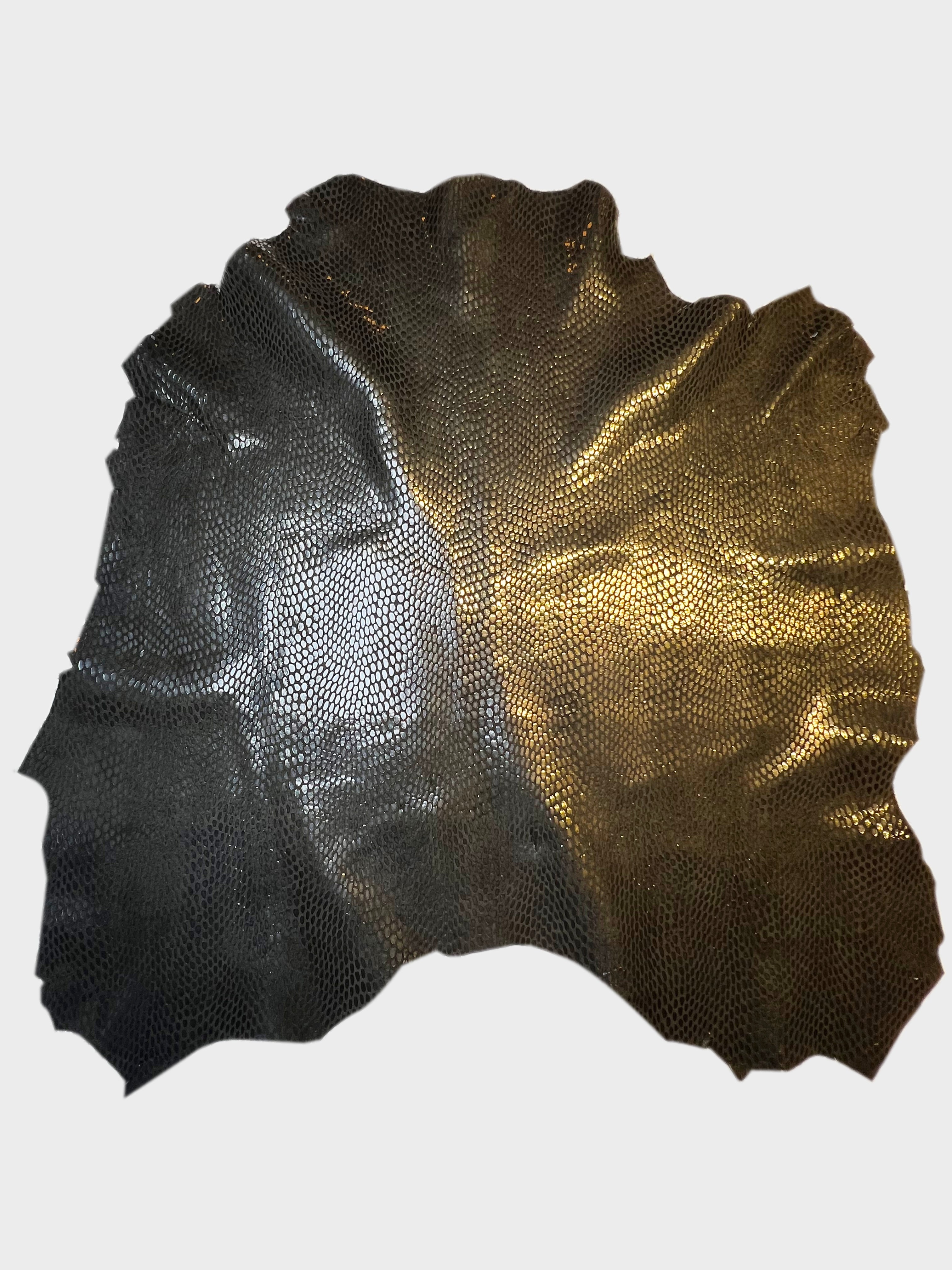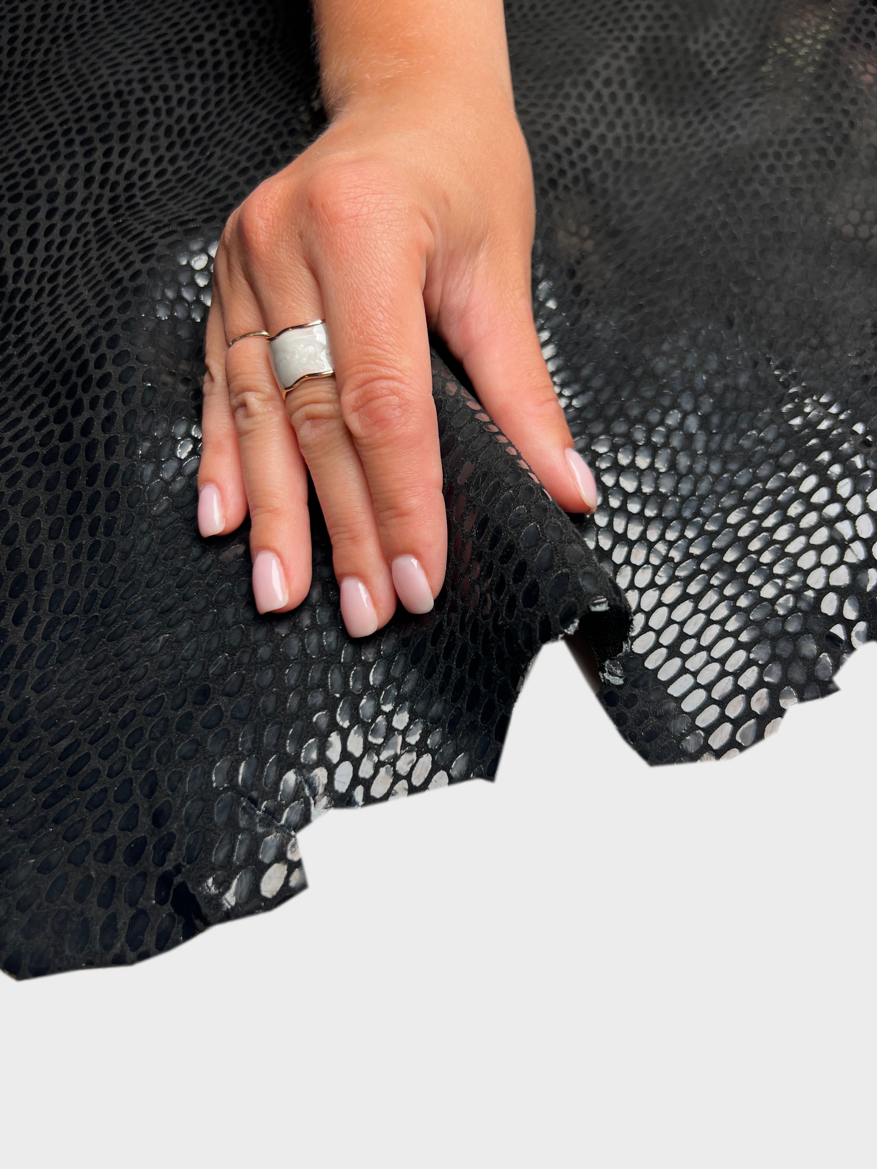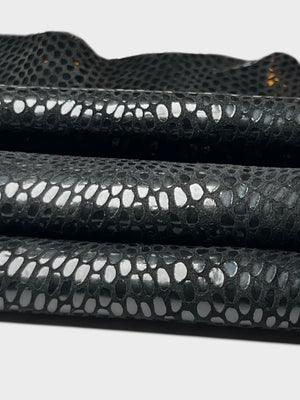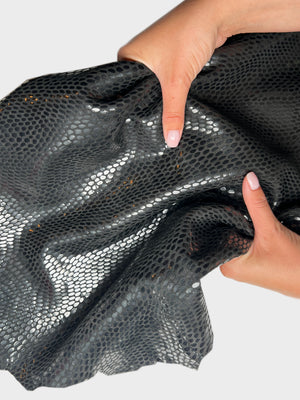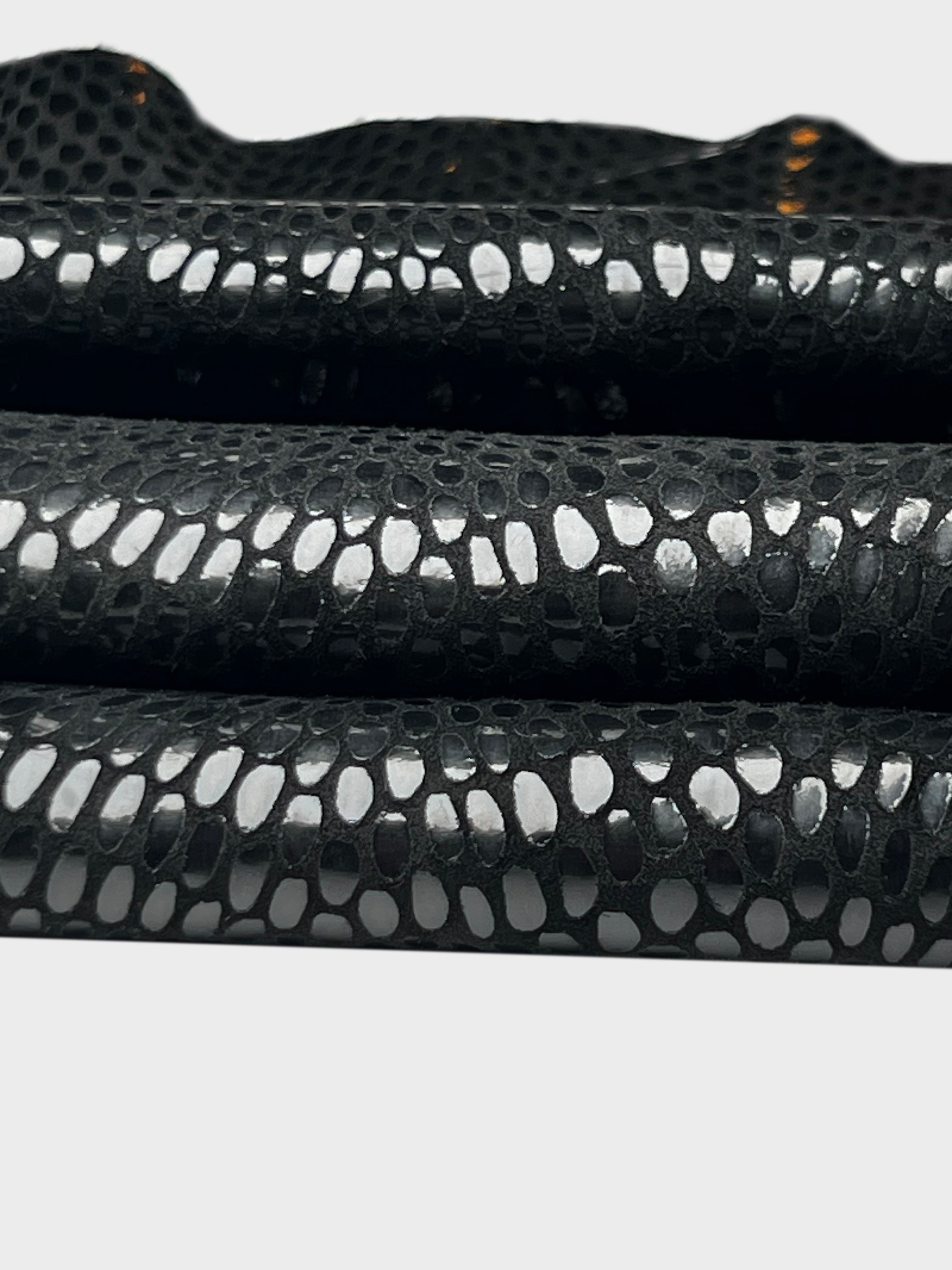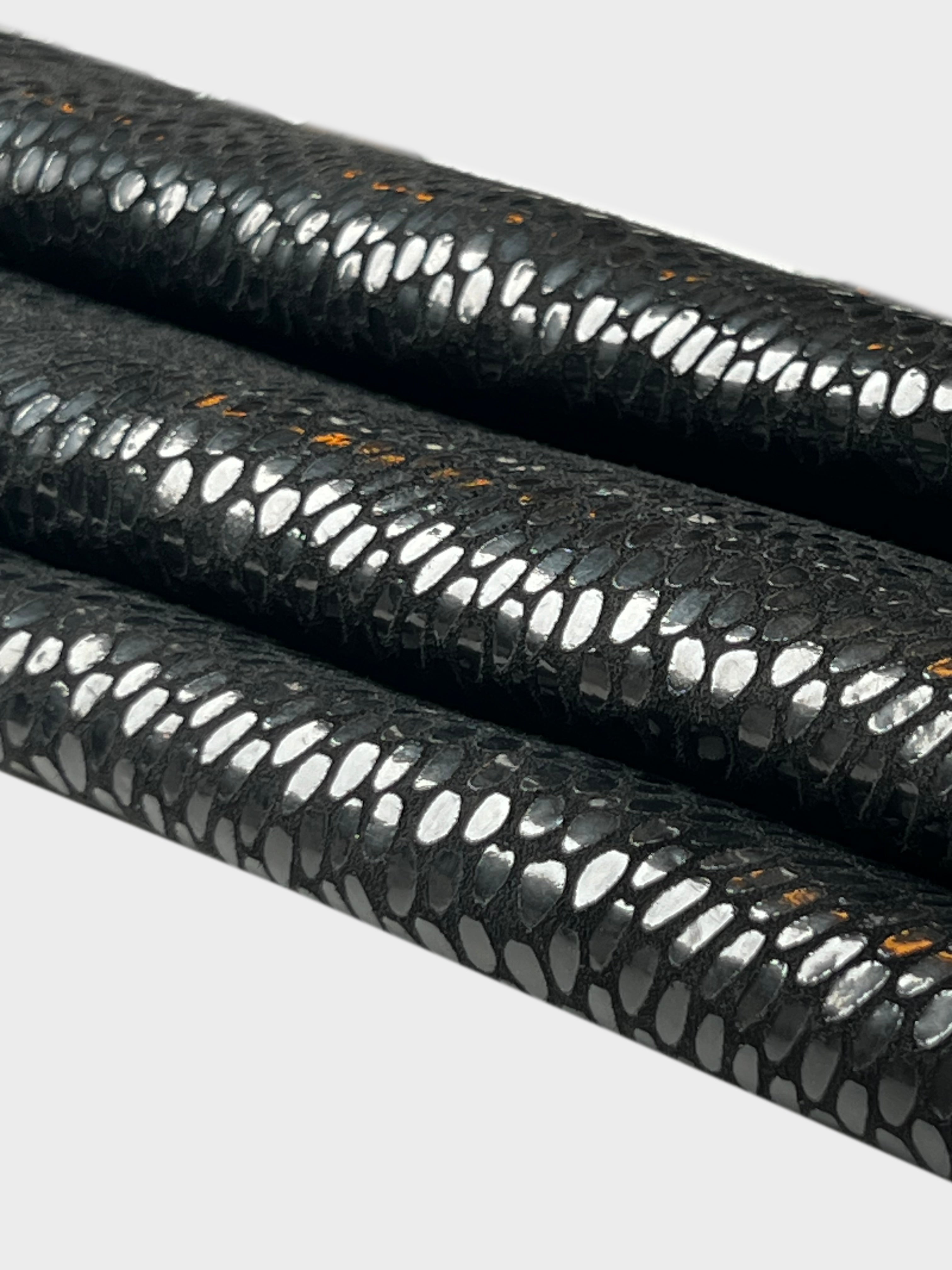 Patentish lambskin with snake scales print. The leather is black with a metallic shine. Thick Italian leather hides.