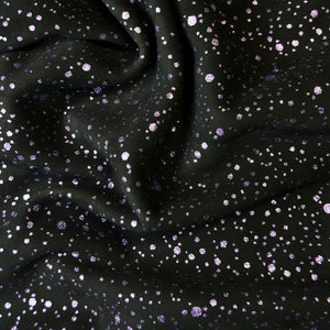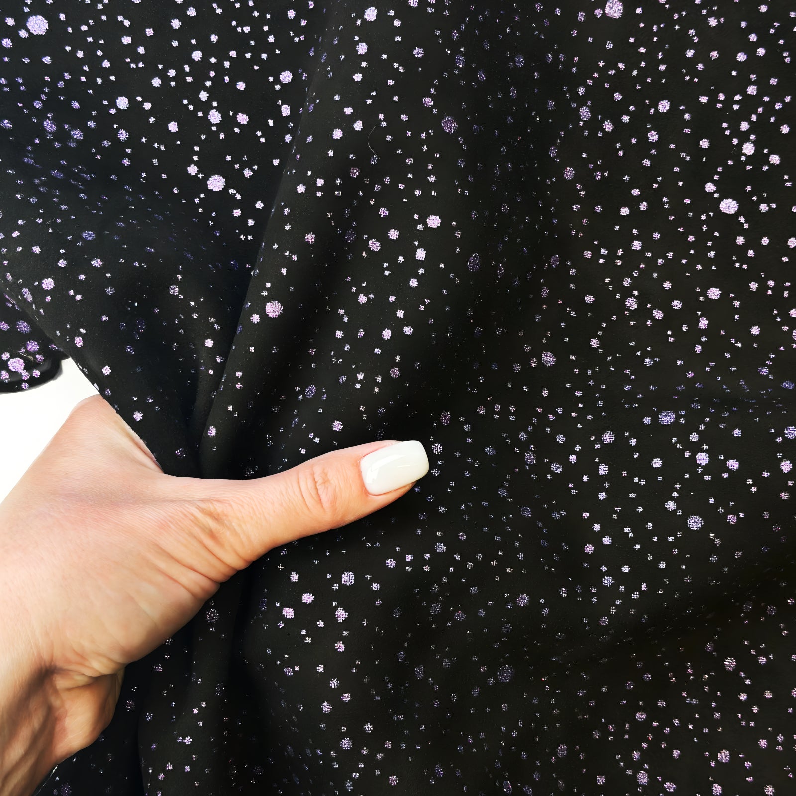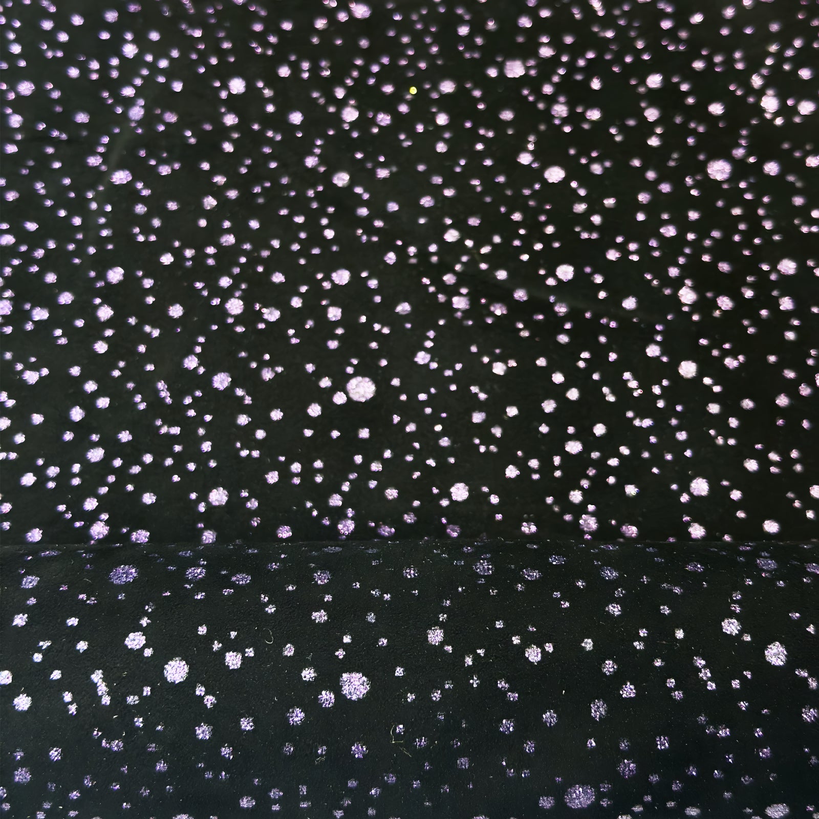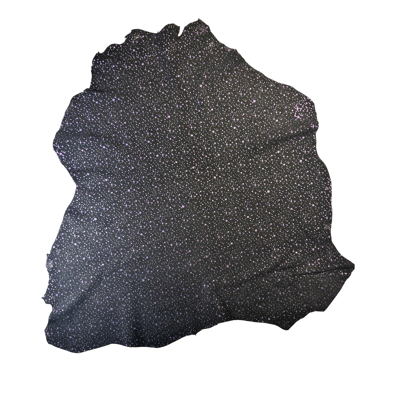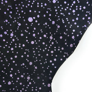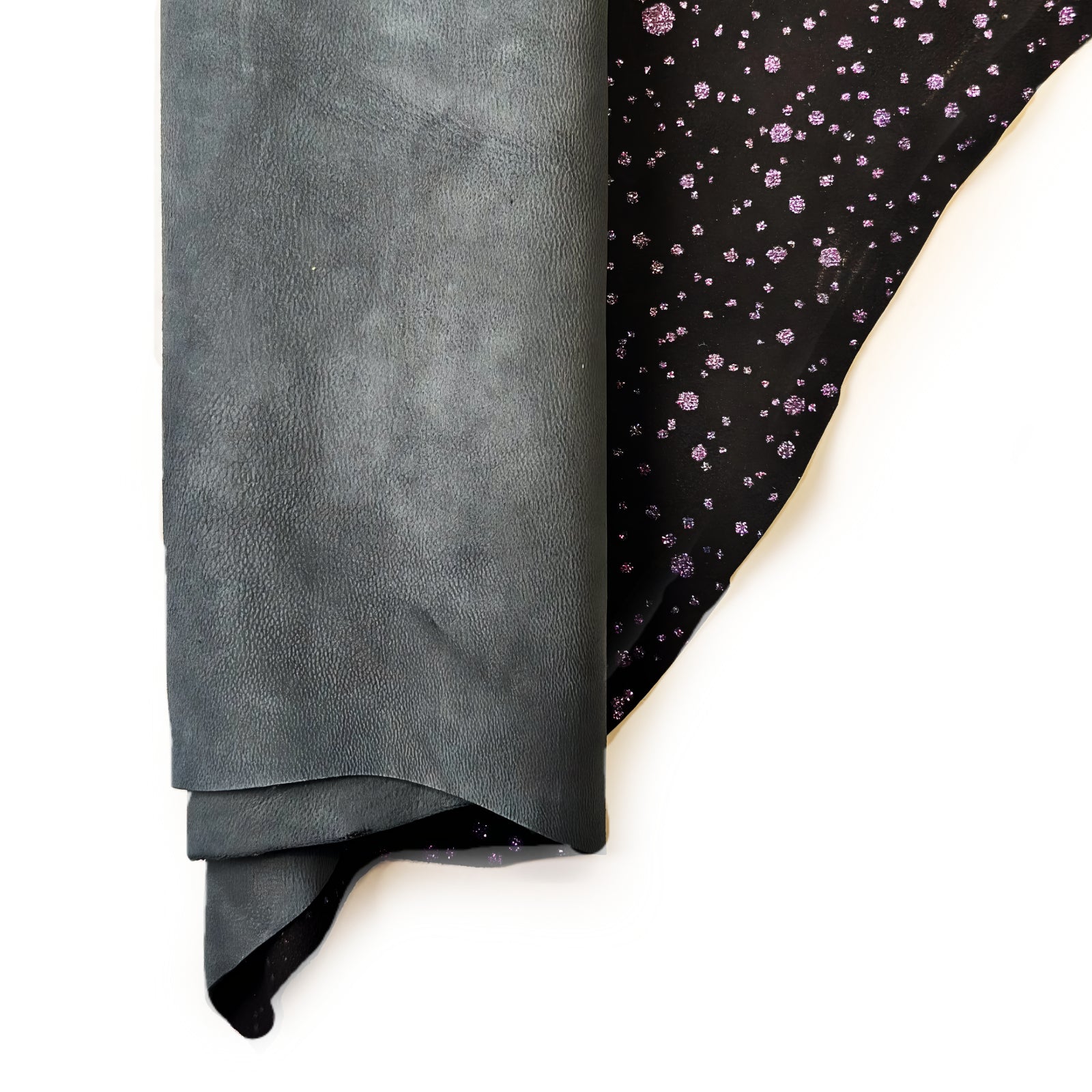 Soft black lambskin with shiny violet metallic dots. Thick velour leather.