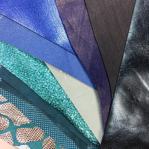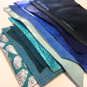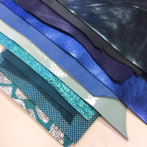 Colors: sky blue, bright blue, ink blue, dark blue, ocean blue/ turquoise, teal metallic, light blue metallic, bright blue metallic also may contain interesting one-of-a-kind textured/printed leather pieces what we have in stock at that moment