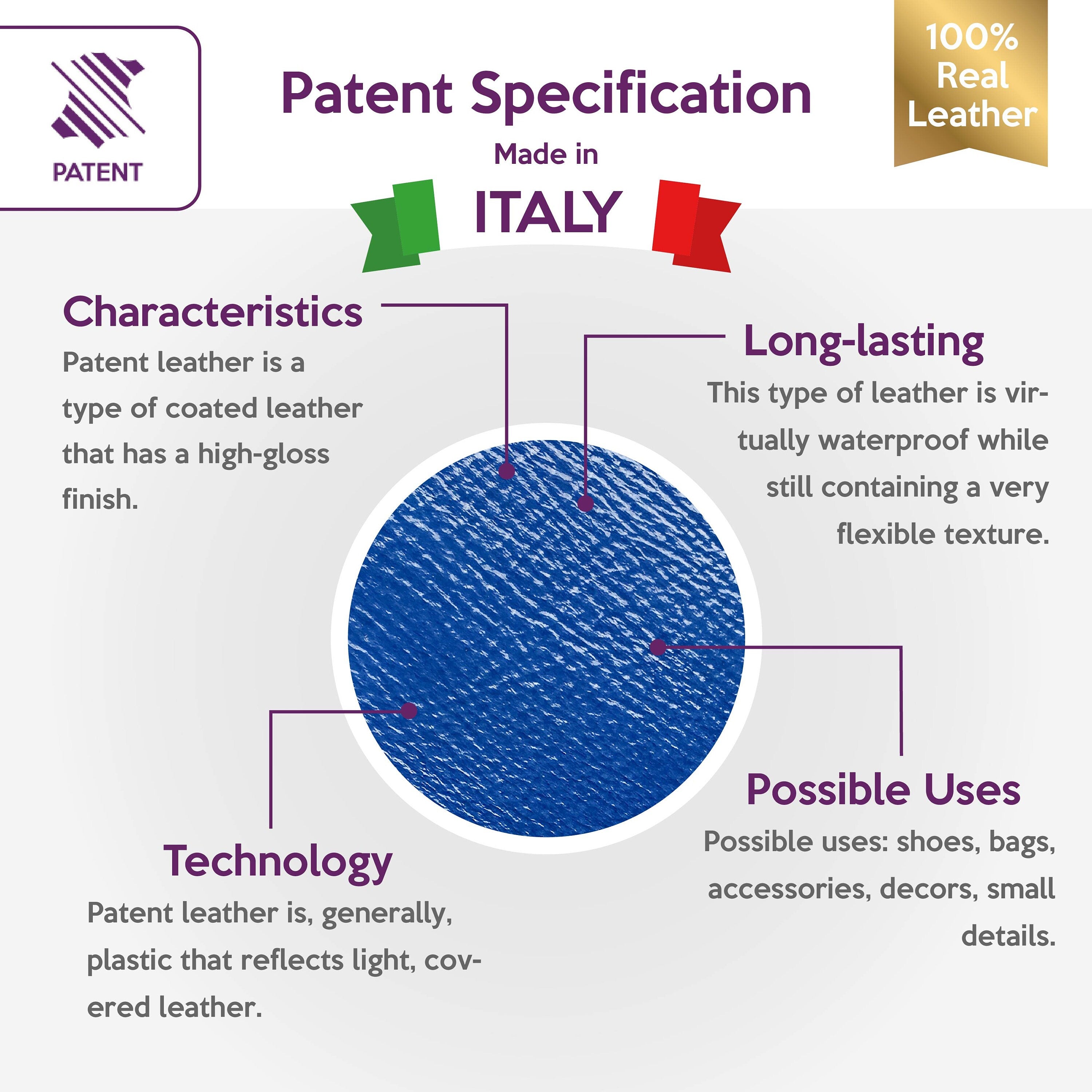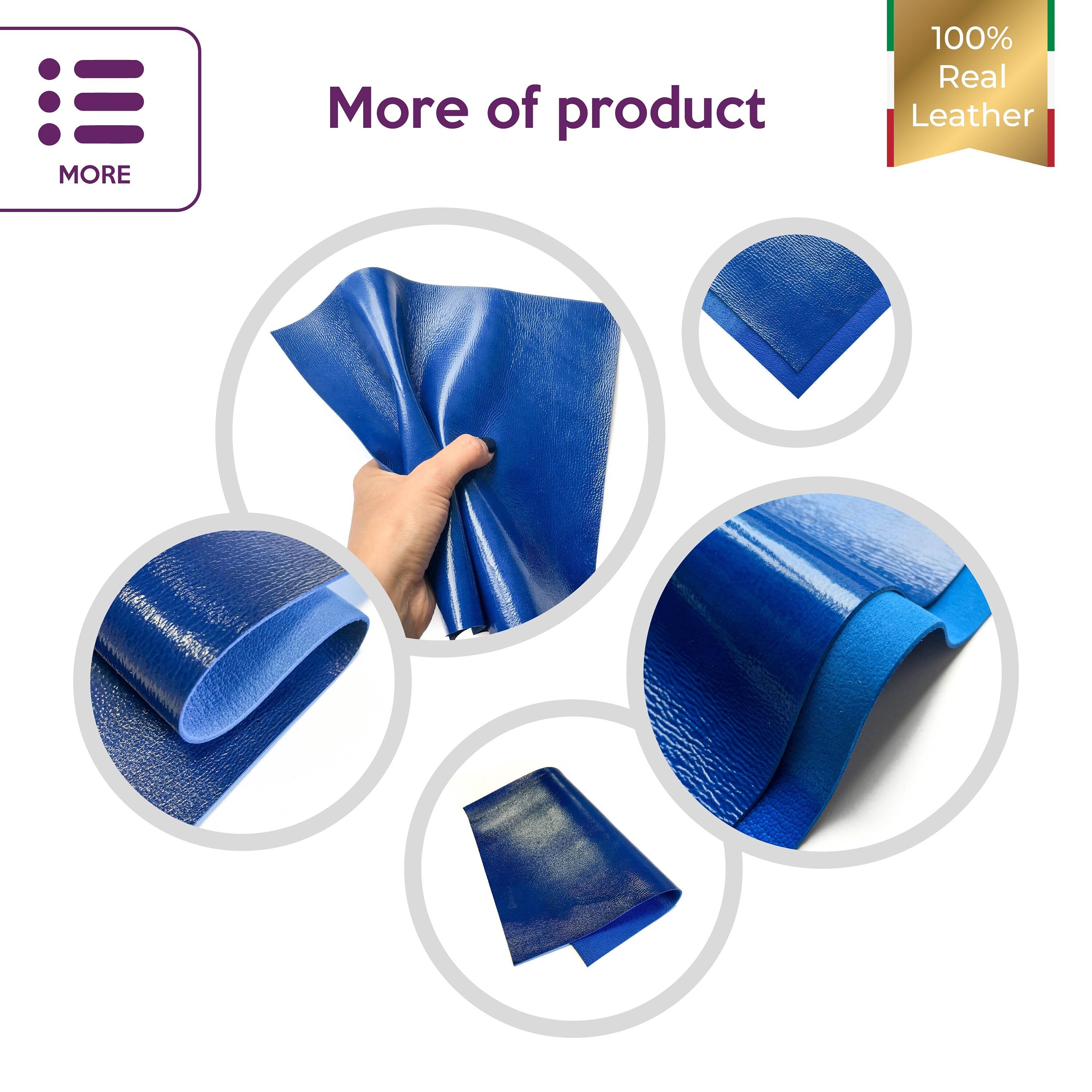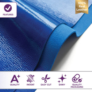 -True Blue leather sheets. Genuine Italian lambskin. Shiny patent leather material for sewing, handcrafting and other cool projects! Medium thin leather sheets with wonderful gloss all over it. At the same time leather is really soft and pleasant for touch, but will hold shape nicely even in if cut in small pieces,
