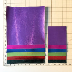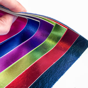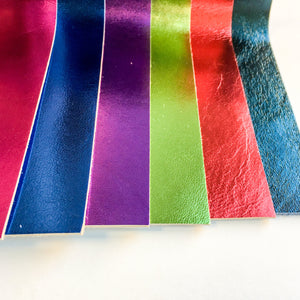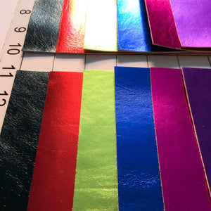 BRIGHT Metallic leather scraps in juicy, modern colors! Unique Leather selection of pre cut natural leather pieces 5x5 or 10x10 inches (12.5x12.5cm or 25x25cm) rectangular metallic leather sample pack with 6 pieces of high quality Italian metallic leather print.