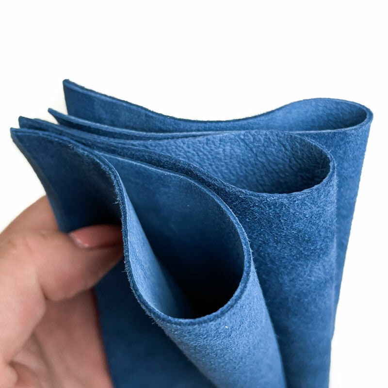 - Classic blue suede leather (size) sheet for sewing. Soft, pleasant and really nice velour material scraps. Real suede leather pieces, soft and rich color.