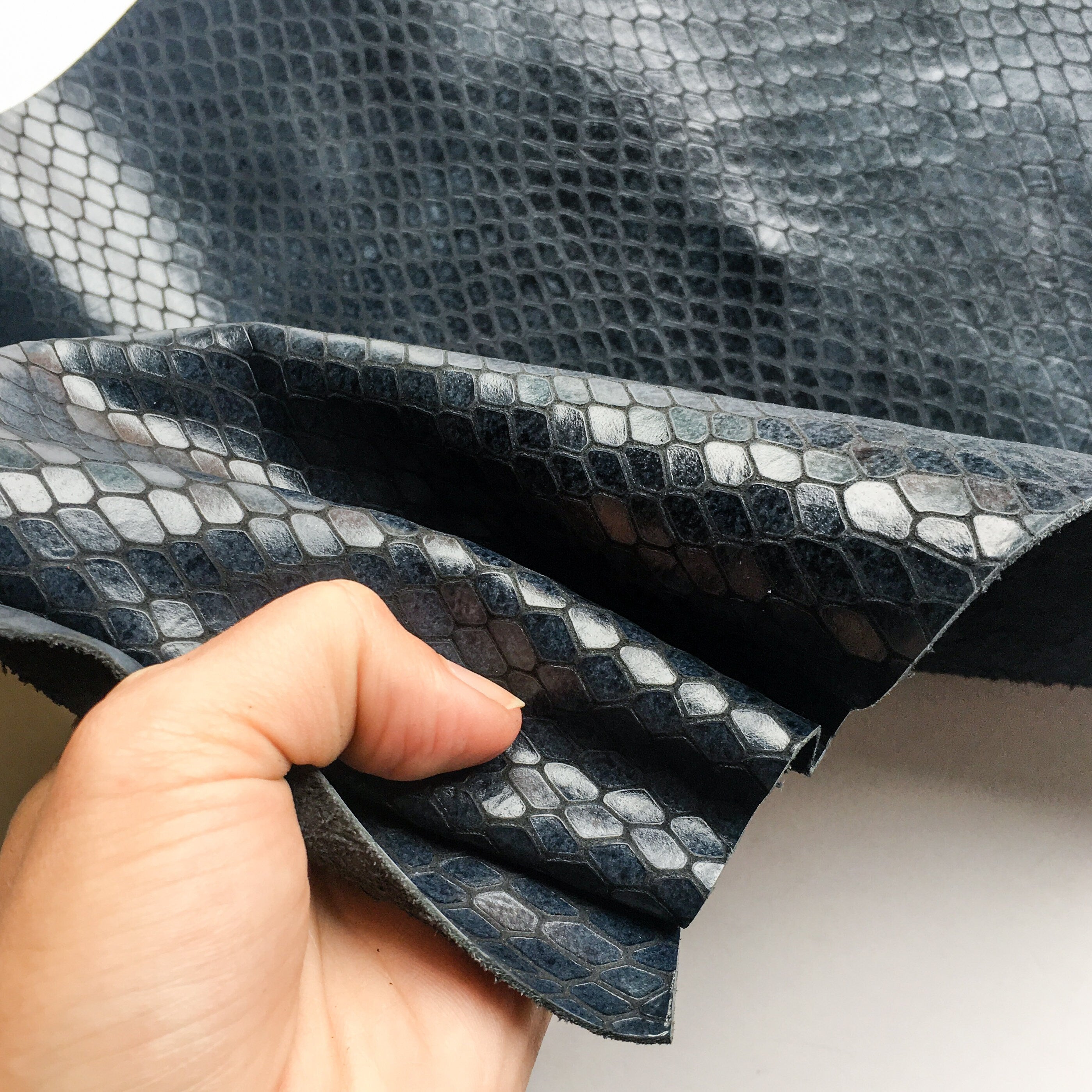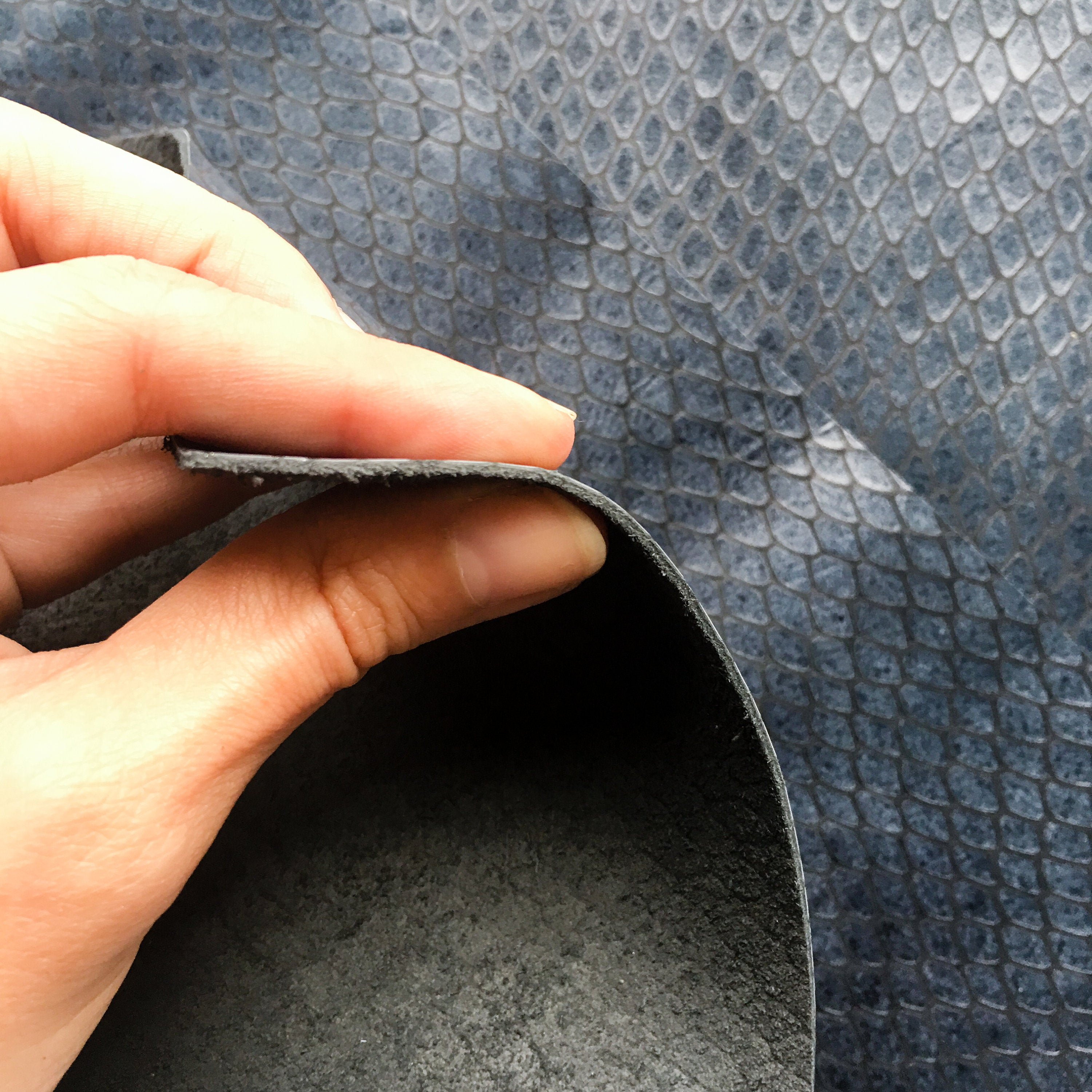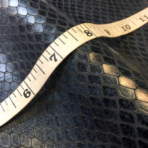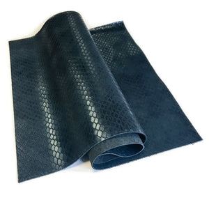 DARK BLUE SNAKE LEATHER PRINT SHEETS Genuine COW skin sheets with fine Snake leather print. Medium thick, bit shiny deep blue color, semi supple and semi pliable calf leather with reptile print. "INDIAN SNAKE" NAME: INDIAN SNAKE CODE: 715(19-4126)1.1 COLOR: Uneven dark blue shades PANTONE: 19-4126 TPG THICKNESS: 1.1 mm / 2.75 oz Sold per piece - 1 sheet We offer other *SHEETS* at sizes: 6x6 inches (or 15x15 cm) 8x10 inches (20x25 cm almost A4 size) 12x12 inches (25x25 cm) 12x18 inches (30x45 cm or bit larger than A3 size) 18x24 inches (45x60 cm, bit larger than A2 sheet) Whole INDIAN SNAKE *HIDES* available here: https://www.etsy.com/listing/676407822 *MATERIAL* -Quite firm, but pleasant for touch, dark blue calf scraps are great for leather crafts, is genuine cow skin leather print. Watery blue shade leather print on shaved calf leather. Can be used as fabric for textured snake skin leather earrings, natural leather material for necklaces and other charming, authentic, vintage leather accessories. Try it! - Please note that genuine leather is natural and part of an animal, scars and imperfections are all part of its character and personality. As every animal is different there aren't too identical pieces of leather in the world. *COLOR* -We do our best to match color and lightning of each skin, please be aware they might not correspond exactly to the ones in the pictures due to the many factors that can distort it (light, display, camera). We use Pantone TPG guide to determine exact color. *SHIPPING & HANDLING* Sheets are packed carefully to avoid crumbling. We ship within 1-3 days after receiving your order. STANDARD International Delivery from Europe: *to Europe - approx. 7 - 21 days. *outside Europe - approx. 10 - 30 days (including USA) EXPRESS DELIVERY (Please send us your PHONE number in DM or add a NOTE at checkout): *Choose Shipping Upgrade *Delivered in 2 - 5 days. >>>Express delivery INCLUDED buying 4 or more whole hides<<< Thank YOU for doing business with Leather AA shop and loving quality Italian leather!