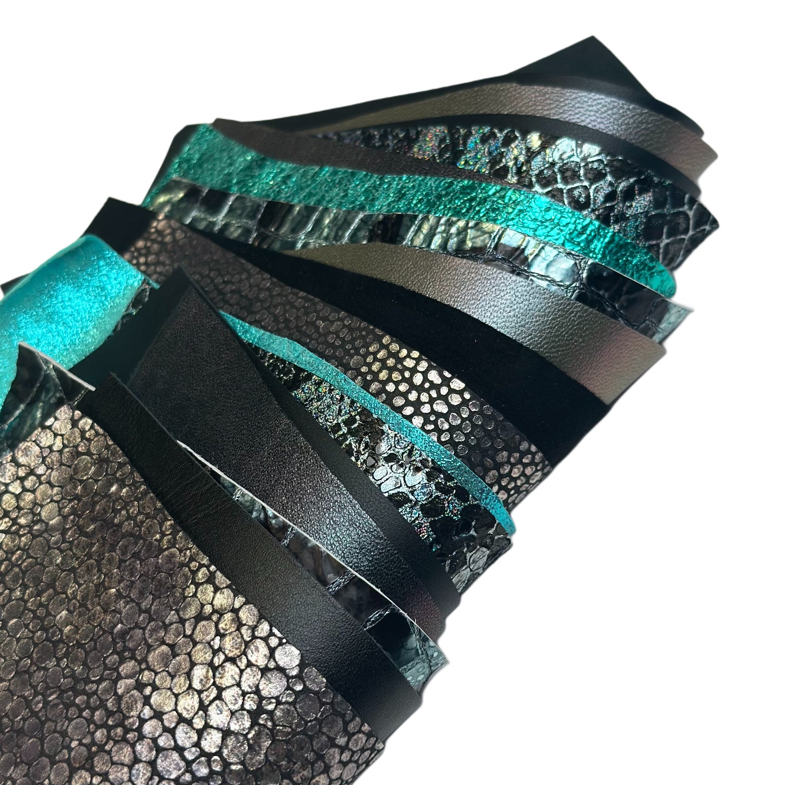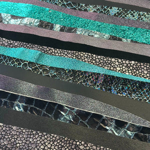 Elevate your crafts with our Galaxy Shine Lambskin Scraps from Skrepi Limited - greenish blue, silver, purple, black - metallics and unique prints! Perfect for leatherworking, jewelry, accessories, and other creative projects, these premium leather pieces are a must-have for any artisan.