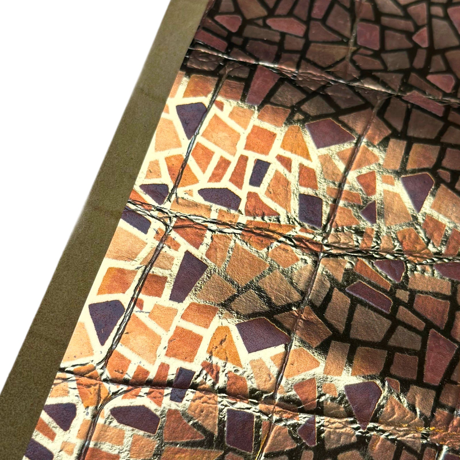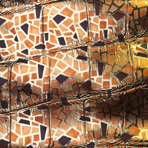 Add a bold and luxurious touch to your next project with this genuine leather sheet, featuring a striking embossed crocodile pattern overlaid with a gold-accented mosaic tile print. This leather combines rich earth tones, deep auburns, and golden metallics, making it perfect for showstopping accessories and premium handmade items.