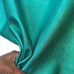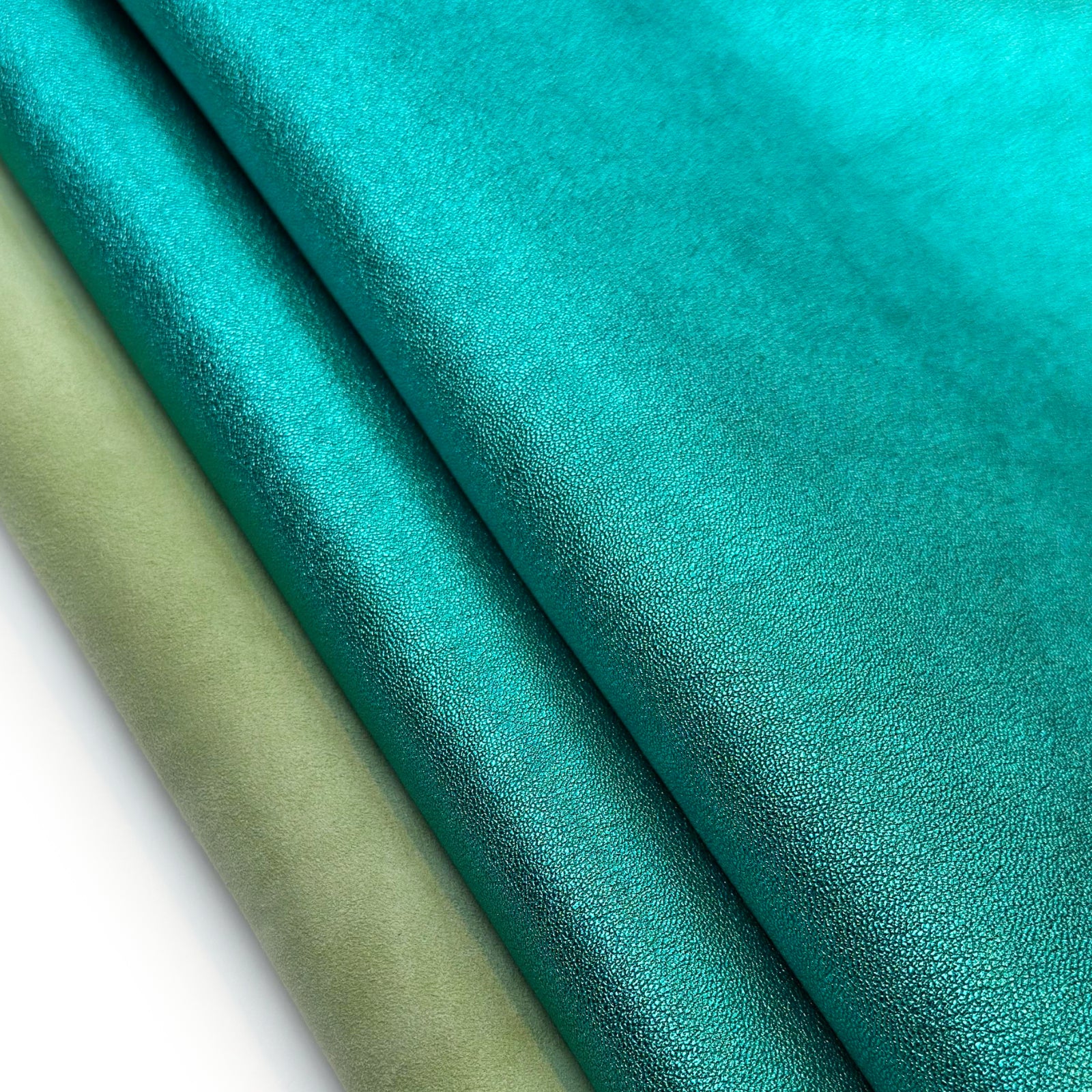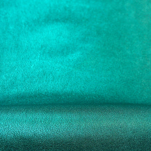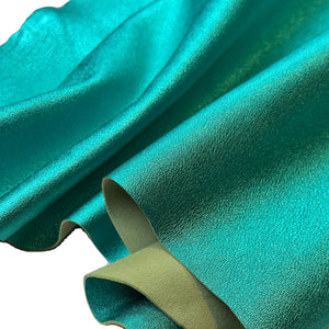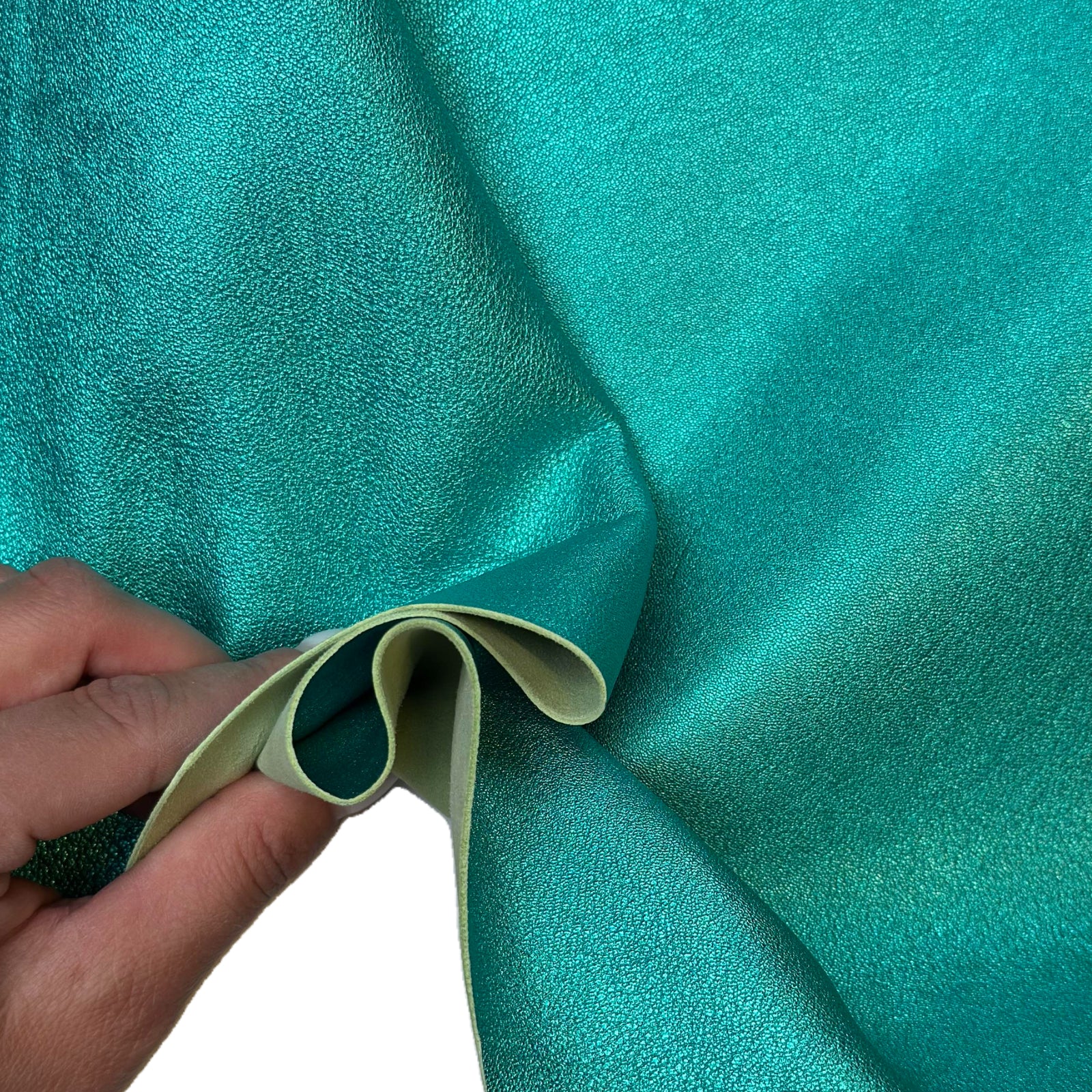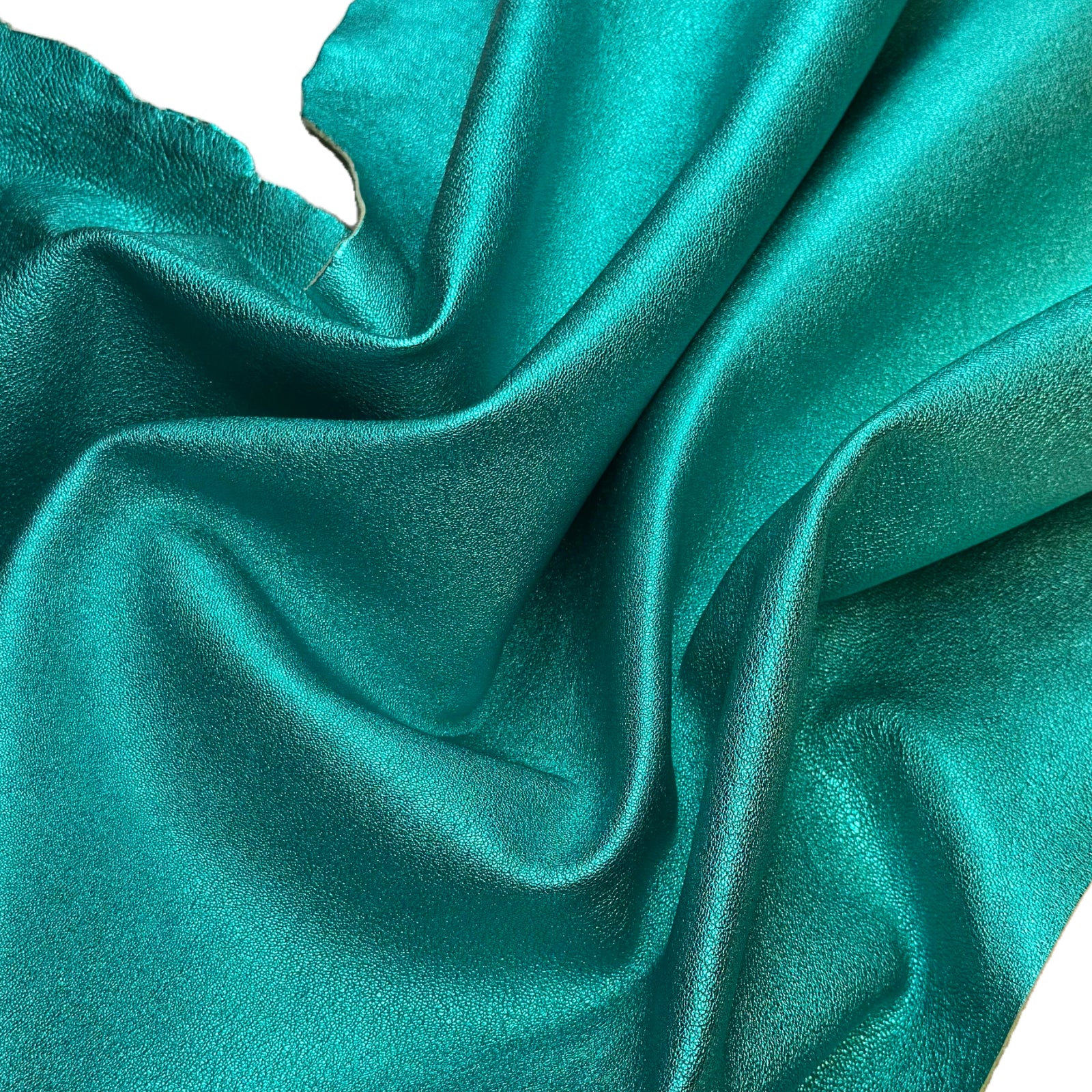 Add a luxurious touch to your creations with this stunning metallic greenish-blue lambskin leather. This leather features a vibrant teal-green color with a gorgeous metallic sheen that catches the light beautifully, giving it a modern, eye-catching look. Soft, supple, and lightweight, it's perfect for crafting high-end handbags, wallets, shoes, clothing accents, jewelry, and other DIY leather projects.