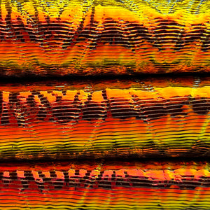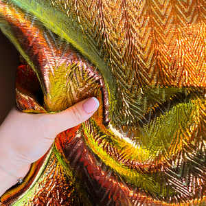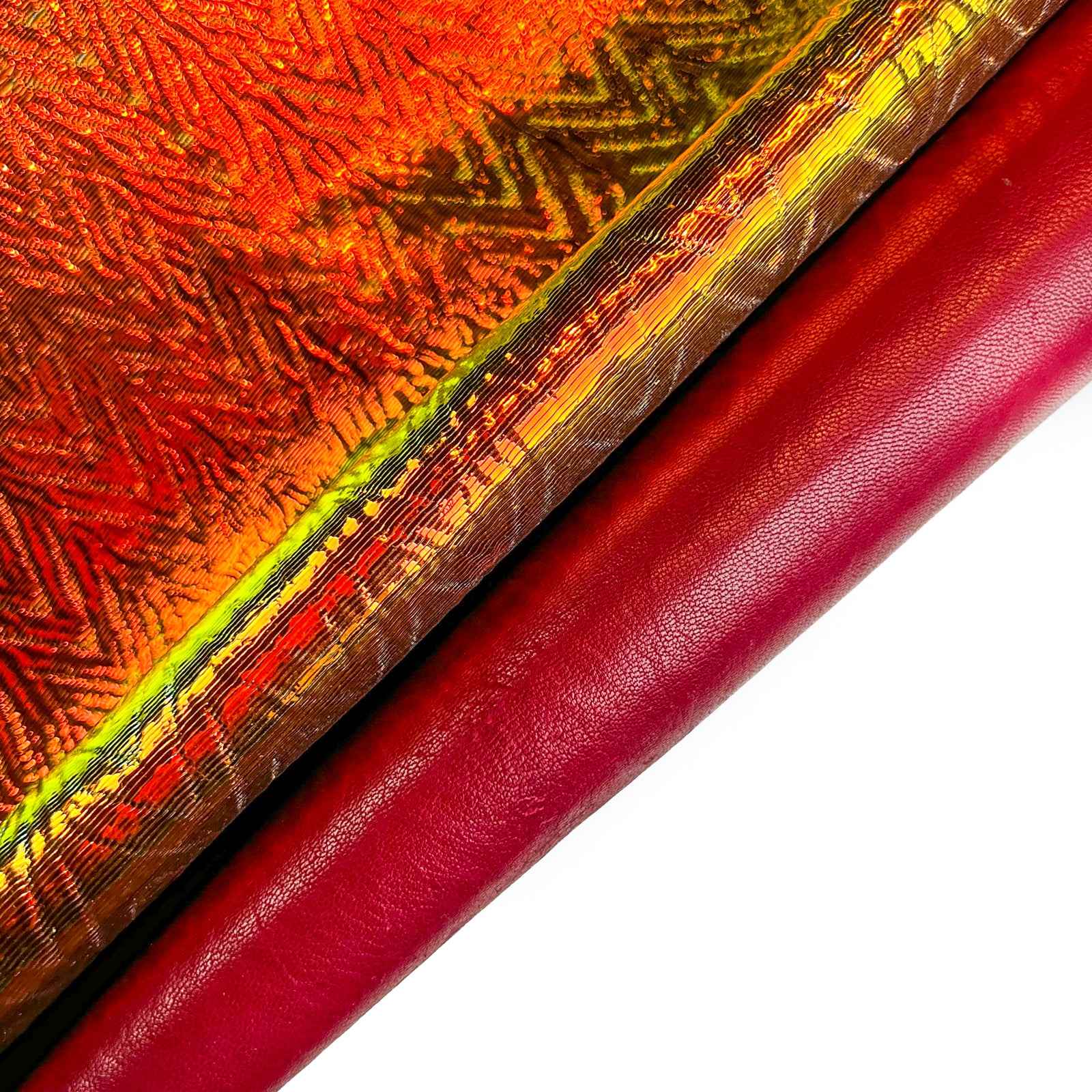 A hologram is definitely the trend of 2023! Bright hologram leather pieces. Glossy orange,red and yellow holographic shades all over the leather. Genuine lambskin hides with embossed zig-zag print.