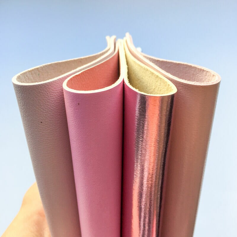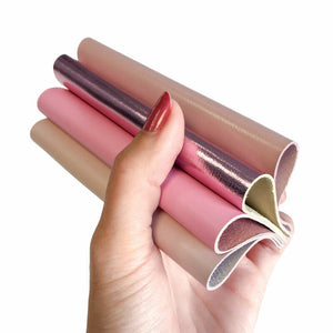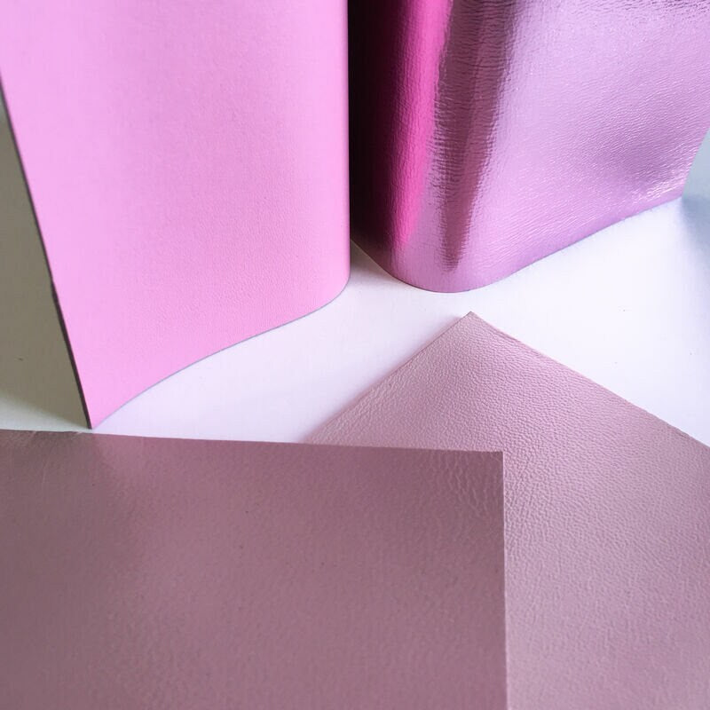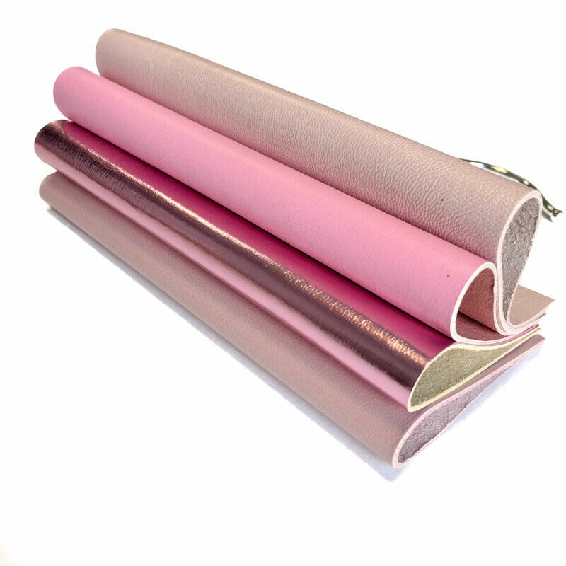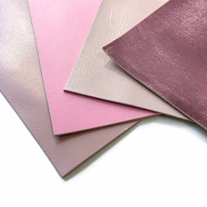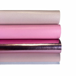 4 Pre-cut leather Sheets in Metallic Pink Leather, Light Pink, Beige pink and bright Barbie Pink piece.