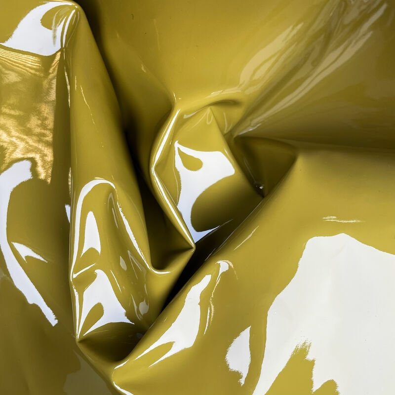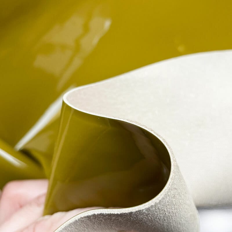 - Mustard color leather. Shiny lacquer leather pieces. Glossy lambskin fabric material. Backside is light beige. Perfect leather for sewing skirts, pants, jackets.