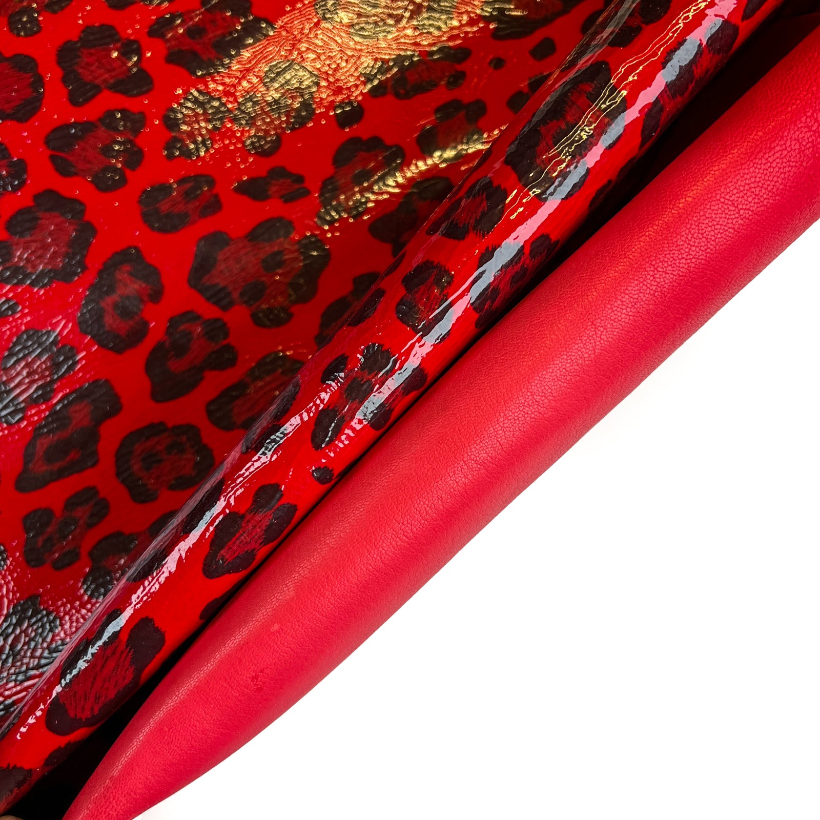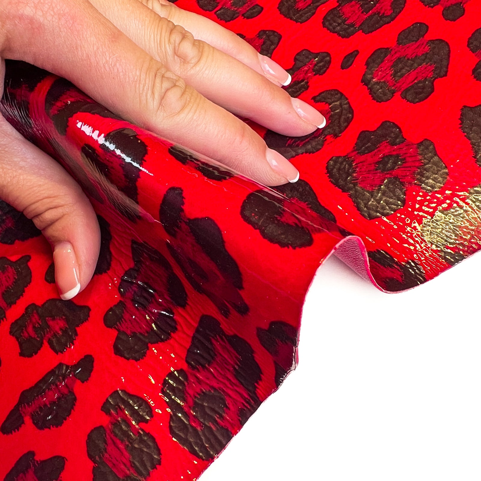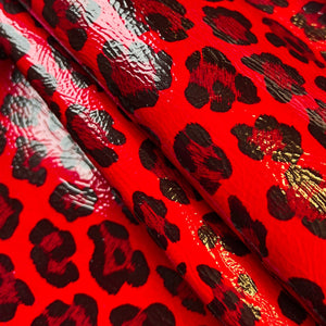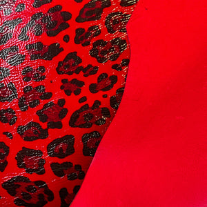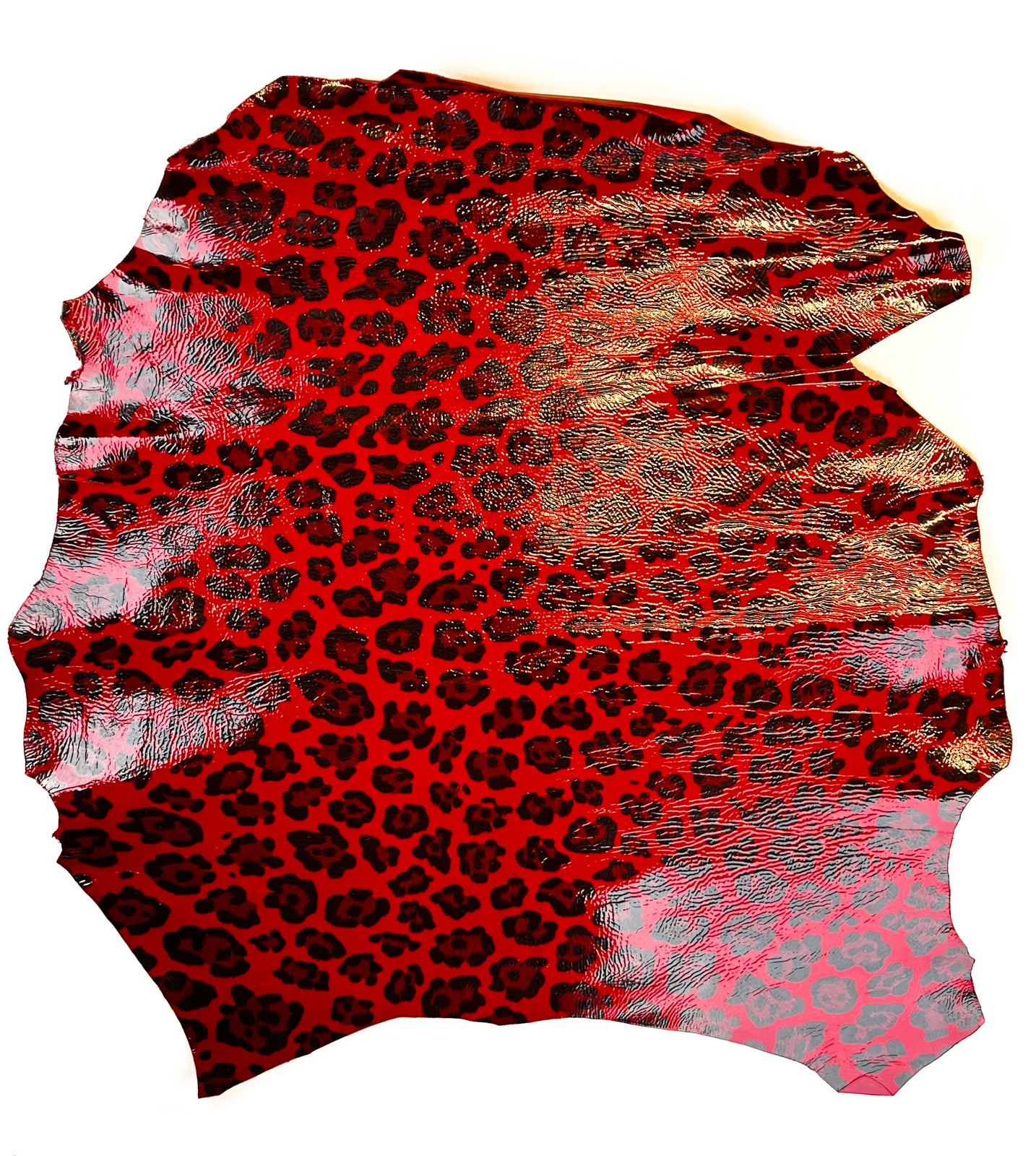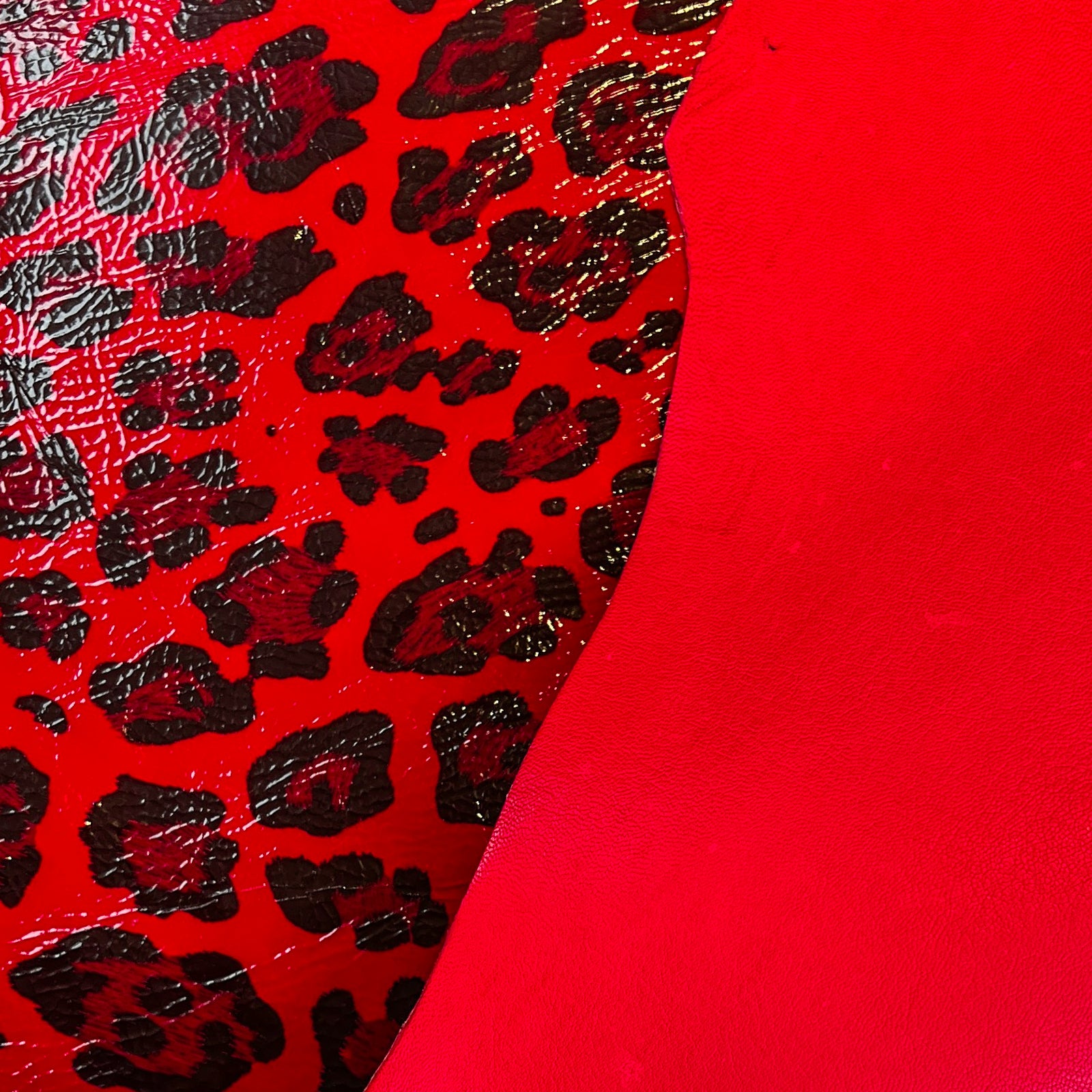 Shiny patent leather hides with a crunchy texture. Red leather with leopard print. Amazing leather for bag and purse crafters will be long-lasting. Our mission is to provide only the highest...