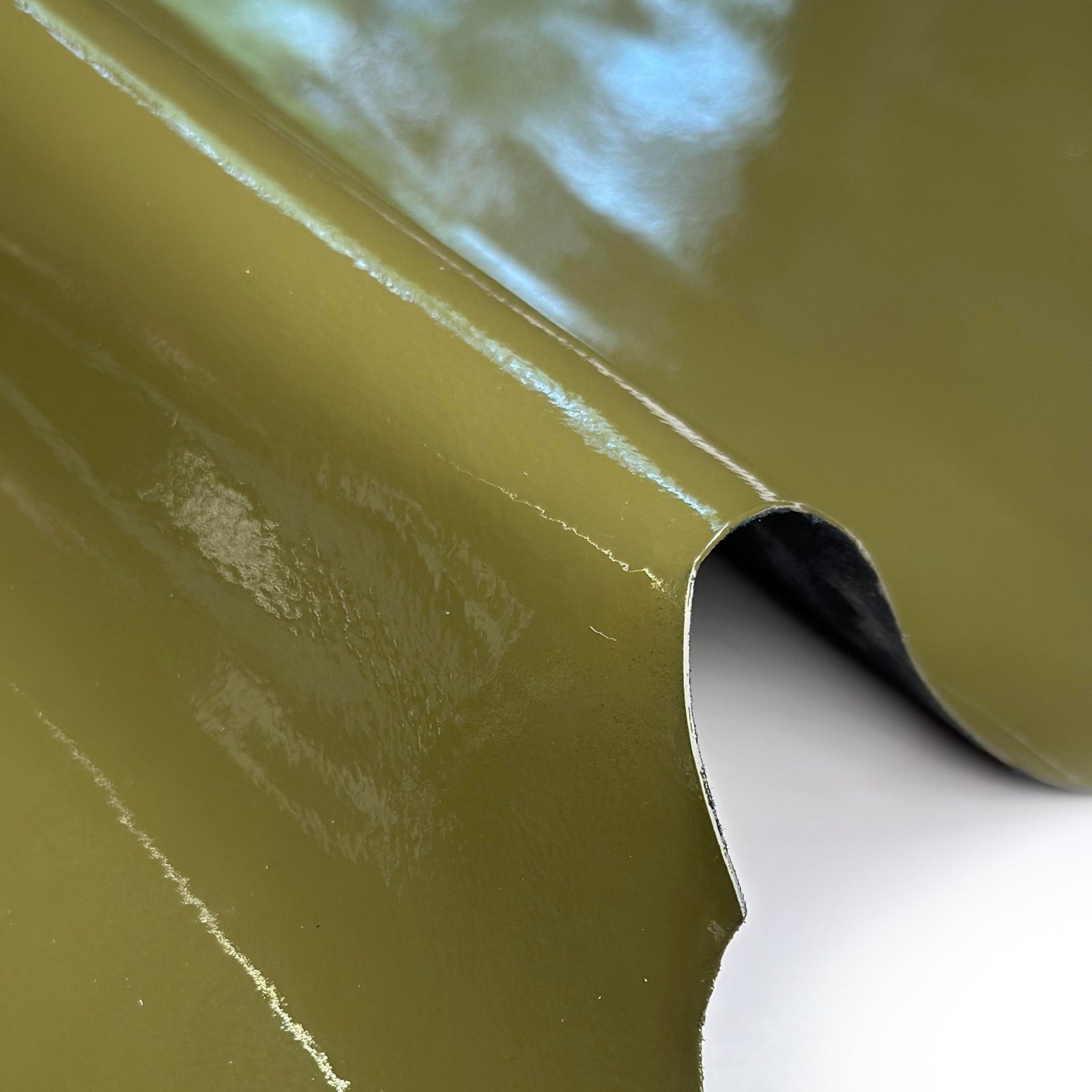 ✨ Add a luxurious touch to your leathercraft with this stunning Shiny Khaki Green Patent Lambskin Leather. Made in Italy, these premium hides are soft, lightweight, and coated with a sleek lacquer finish for a high-gloss shine.