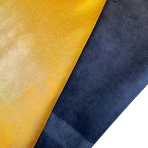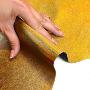 Shiny and soft metallic yellow gold hides with holographic shine. Amazing leather for bag and purse crafters will be long-lasting. Our mission is to provide only the highest quality Italian leather to other leather workers, crafters of all kinds, small businesses, or shops for your own projects.